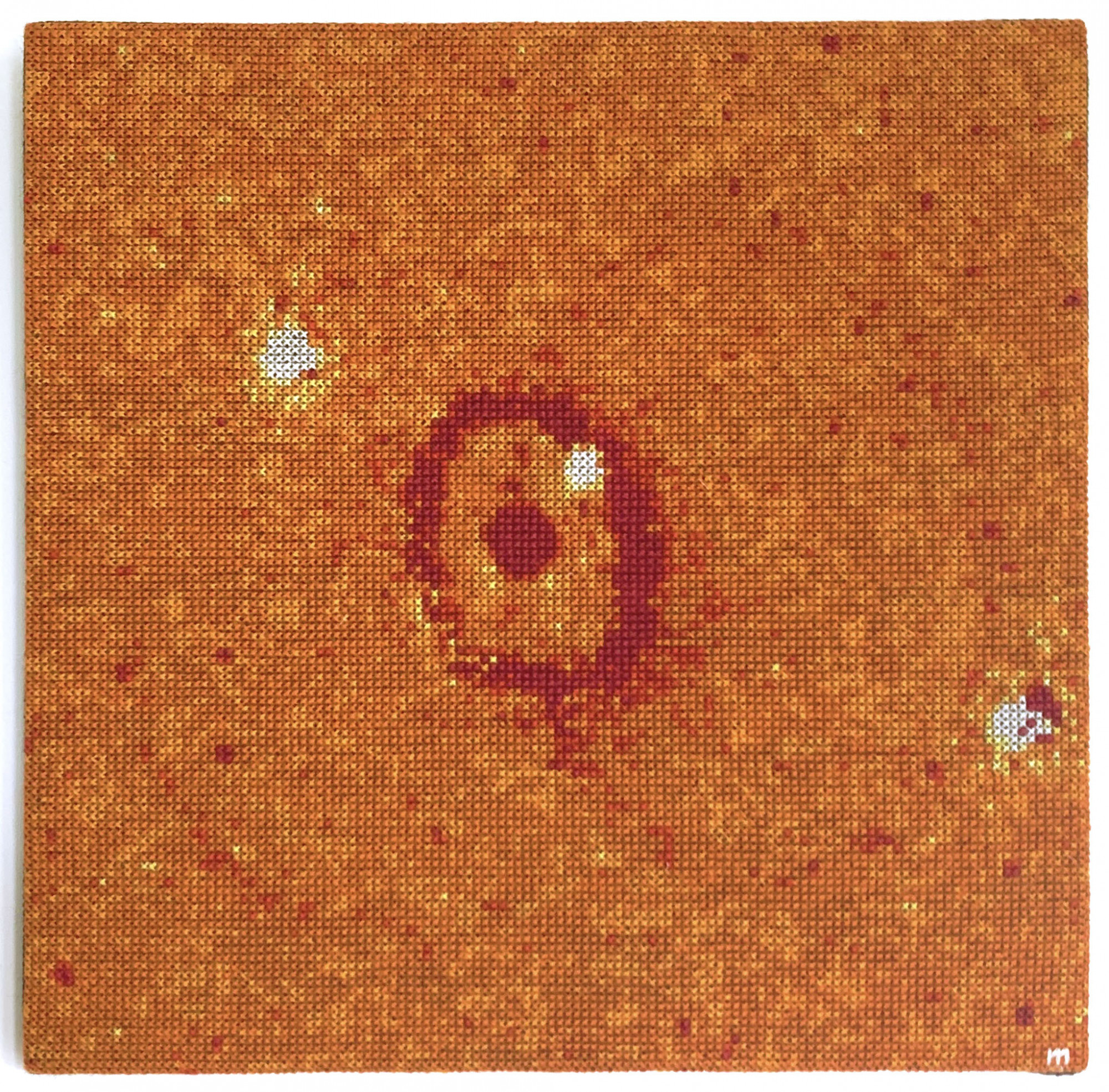 400 € | 18 × 18 cm | Représentation de la supernova 1987A, d’après une prise de vue de Hubble. / Broderie au point de croix. – 2022 | |